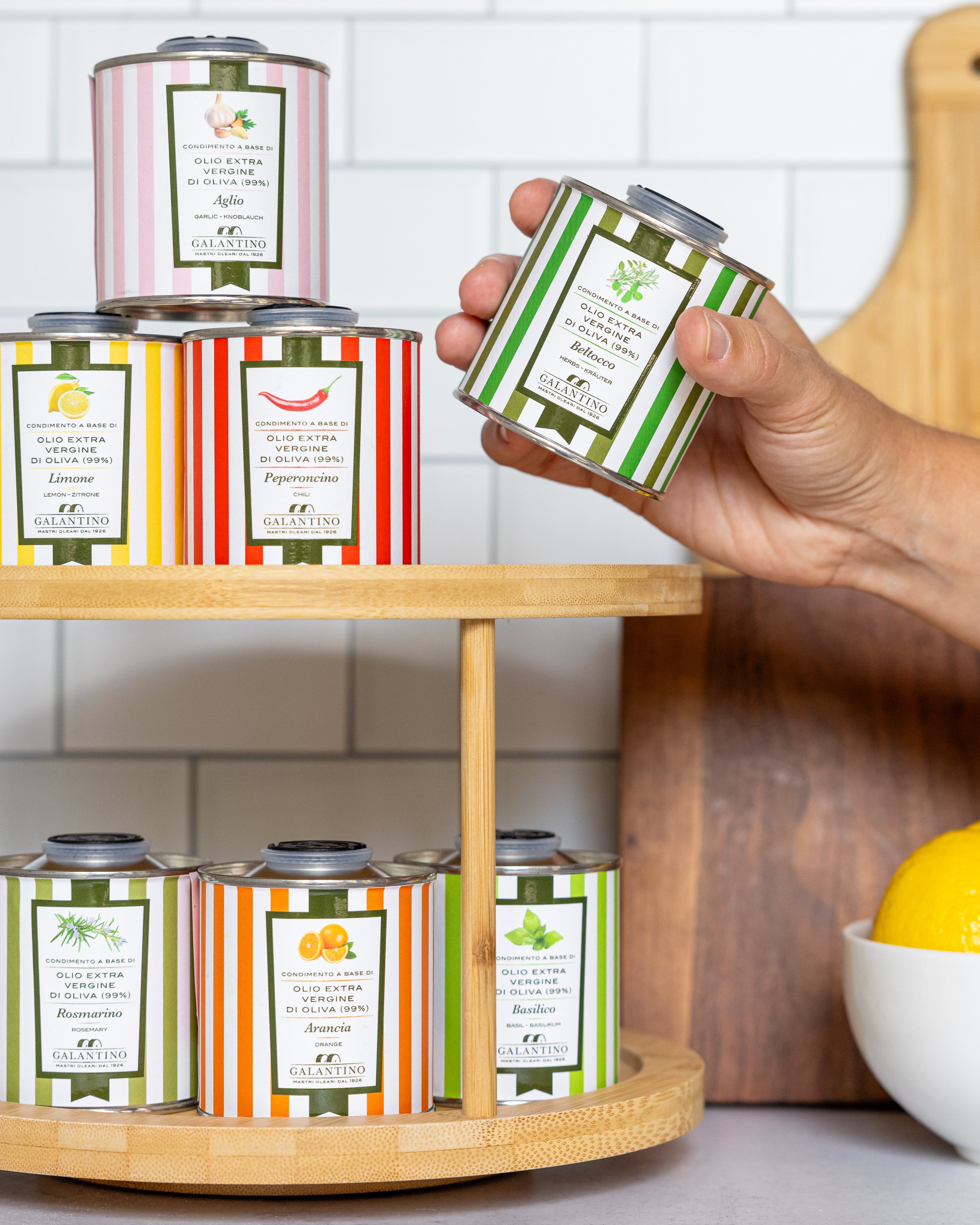Discover the passion of the Galantino family, masters of extra virgin olive oil since 1926. They only select the best olives from their groves near Bari, in Puglia, a region that produces more olives than anywhere else in the world. Galantino’s Ogliarola and Coratina olives are hand-harvested the traditional way, by shaking the branches of the olive trees so that the olives fall gently onto canvas “hammocks,” then milled with traditional granite millstones. Through cold extraction and strict quality testing, Galantino ensures that their extra virgin olive oil is consistently the best. With artistic packaging and fresh and smooth qualities, Galantino oils have won the most important international awards and accolades.