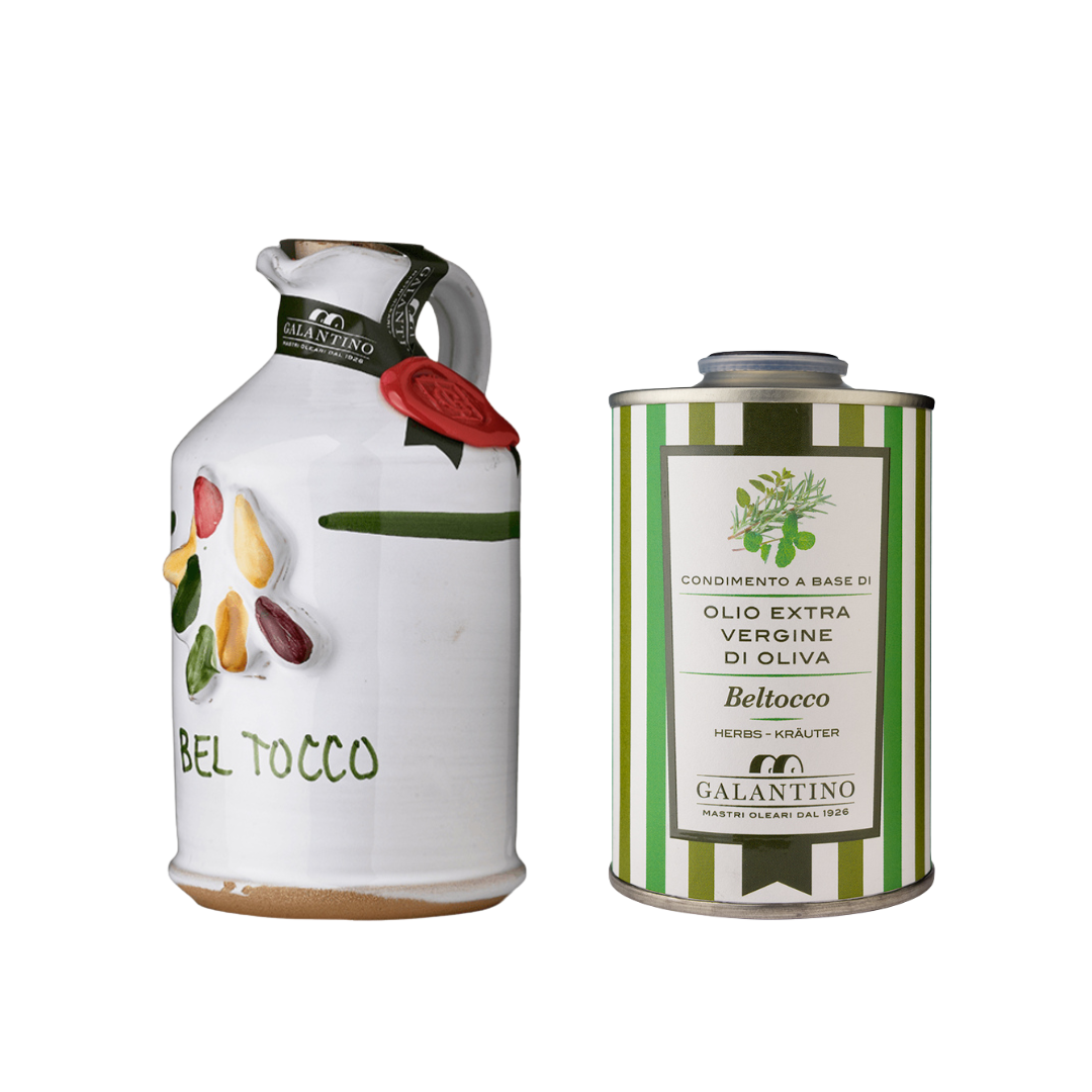 This bundle features a hand painted ceramic bottle filled with Galantino aromatic herb extra virgin olive oil conveniently paired with a refill tin of the same premium aromatic herb olive oil.