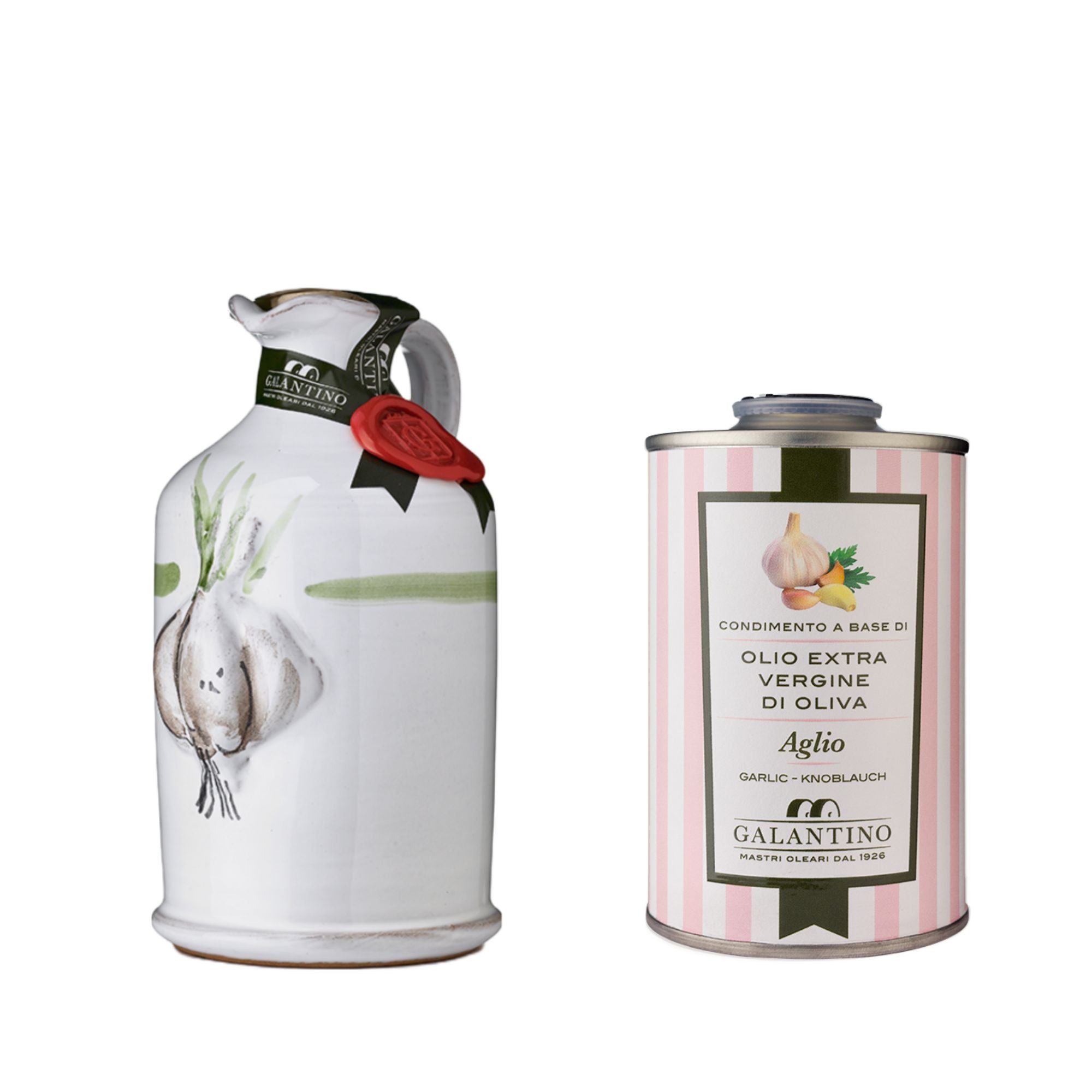 This bundle features a hand painted ceramic bottle filled with Galantino garlic extra virgin olive oil conveniently paired with a refill tin of the same premium garlic olive oil.