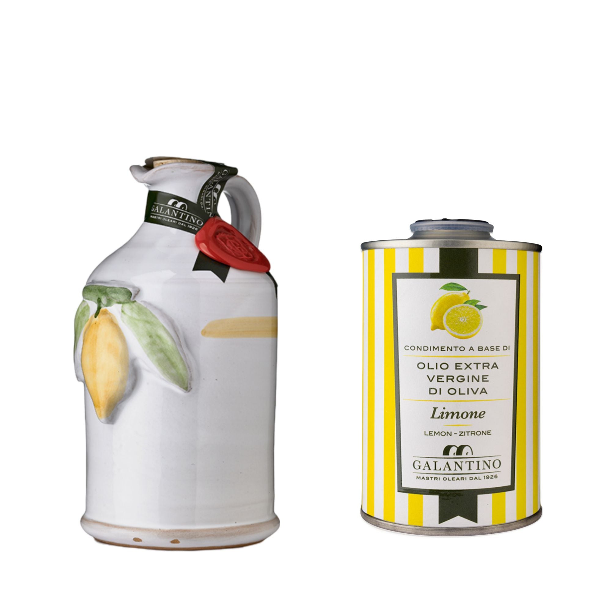 This bundle features a hand painted ceramic bottle filled with Galantino lemon extra virgin olive oil conveniently paired with a refill tin of the same premium lemon olive oil.