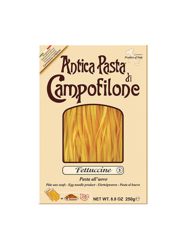 Fettuccine is a highly versatile cut of pasta and pairs beautifully with any meat, fish or vegetable sauce. This delicious egg fettuccine from Campofilone is light and bouncy and cooks up quickly.