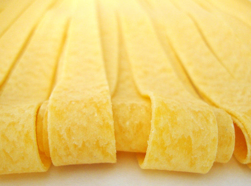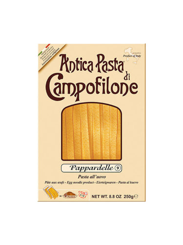 These Pappardelle are 12 mm wide large and made from carefully selected non-GMO Italian wheat and pasture raised eggs. They are bronze drawn, rolled out on sheets of pure cellulose paper and dried at low temperatures. Pappardelle is best served with wild game, bolognese and vegetable sauces.