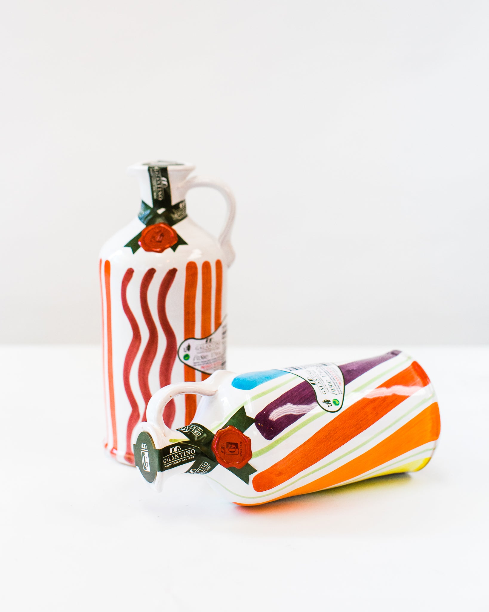 The “Fantasia" ceramic bottle comes in a variety of colors and patterns and is hand-painted by local artisans of the Puglia region of Italy, where the award-winning Frantoio Galantino olive mill is located. It is filled with their delicious and authentic extra virgin olive oil.