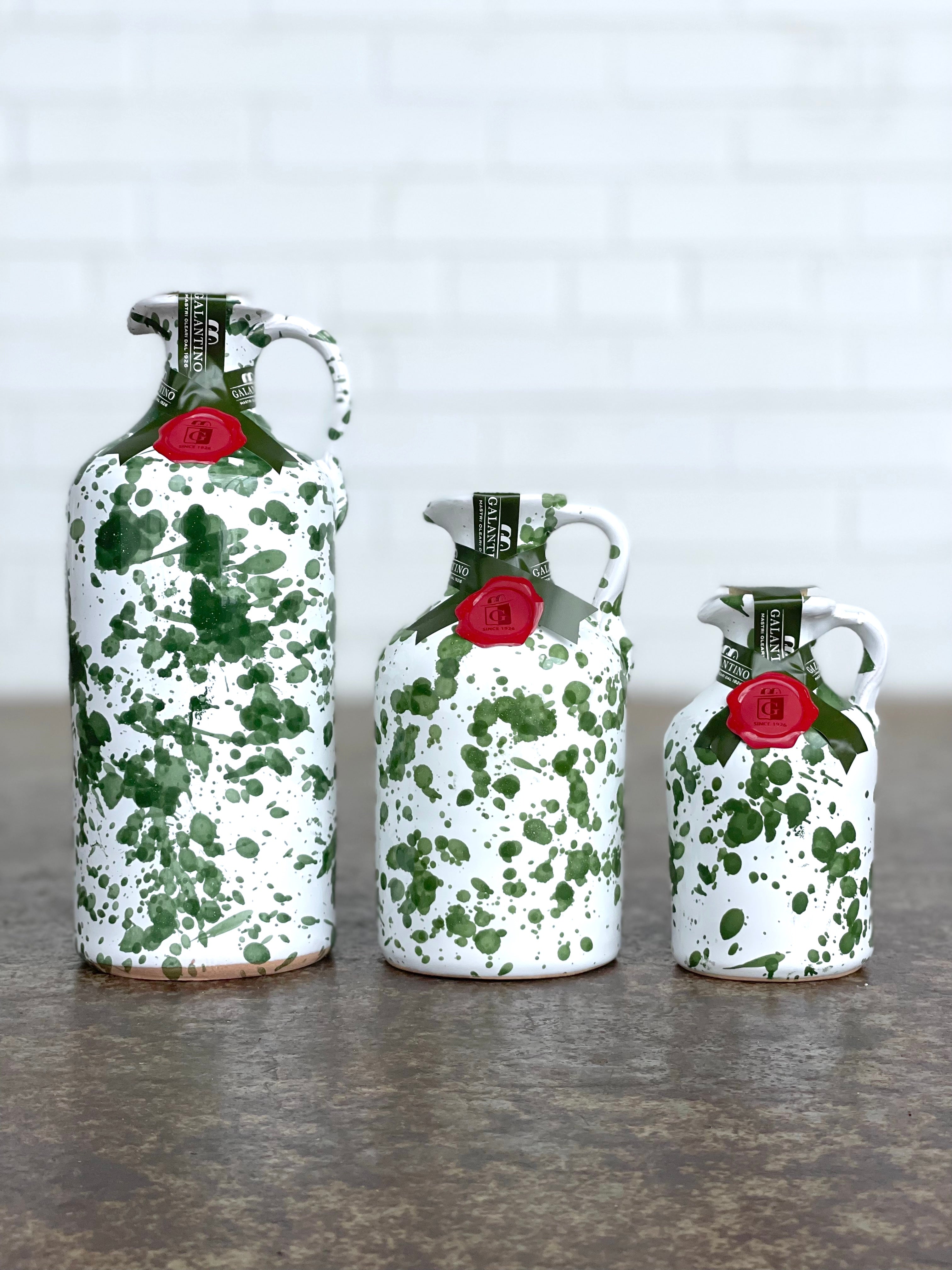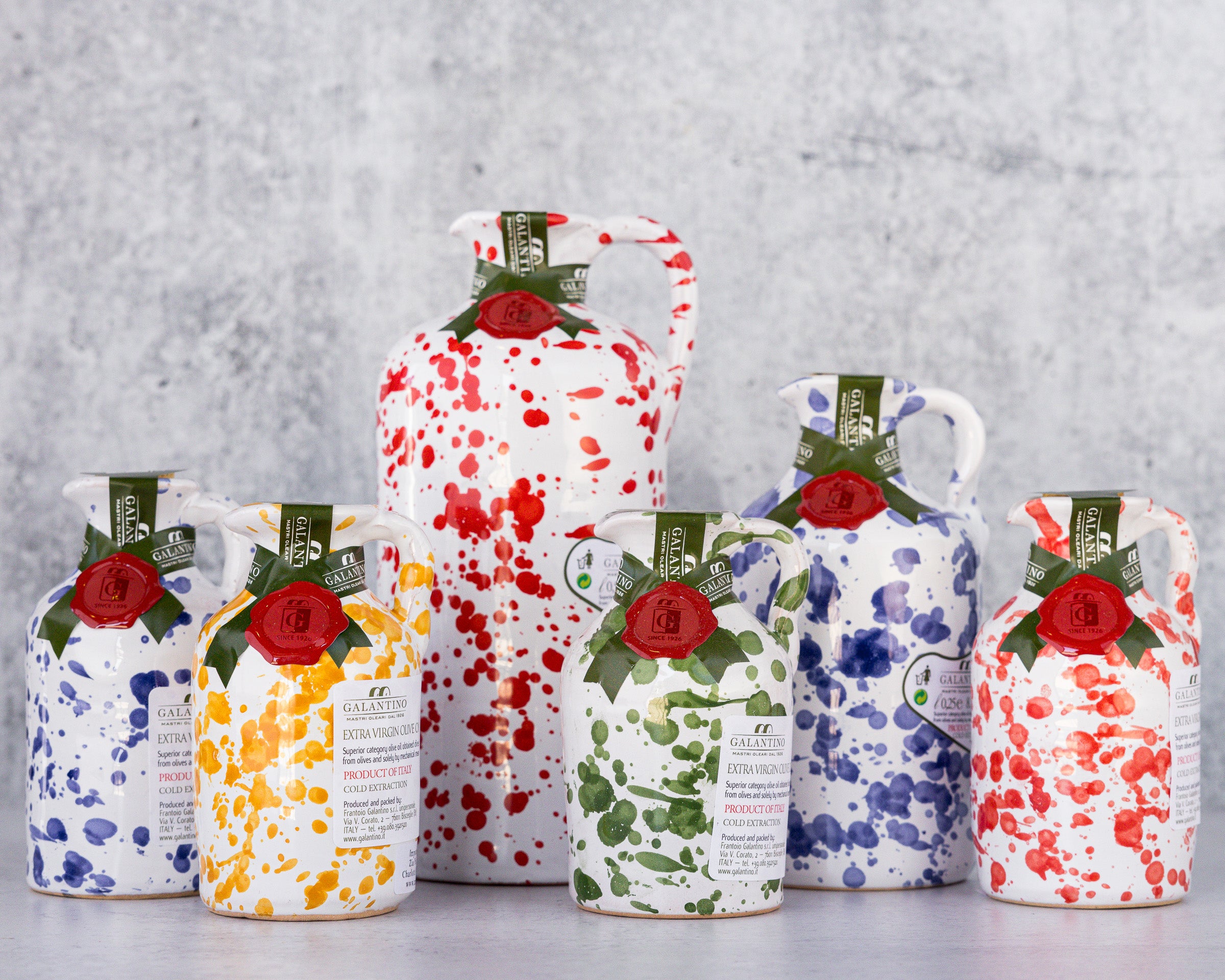The “Fantasia" ceramic bottle comes in a variety of colors and patterns and is hand-painted by local artisans of the Puglia region of Italy, where the award-winning Frantoio Galantino olive mill is located. It is filled with their delicious and authentic extra virgin olive oil made from Ogliarola and Coratina olives. Golden yellow-green in color and well balanced flavors of almond and artichoke make this an ideal extra virgin olive oil for everyday use. Great for cooking and for dressing a salad.