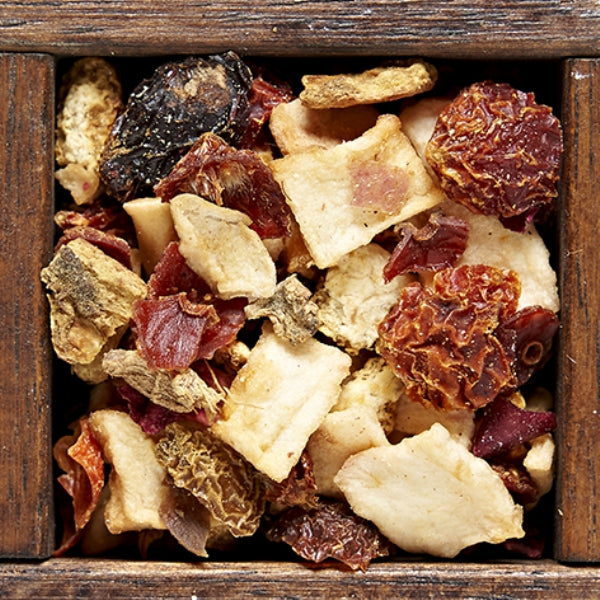 Warm and fruity, this naturally caffeine-free herbal tea combines the invigorating spice of ginger root with the delicate sweetness of pomegranate. The result is a beautifully balanced infusion with a pale pink hue, a bright, fruity aroma, and a mild, subtly tangy flavor. A modern take on ancient ingredients, this blend is both soothing and refreshing.