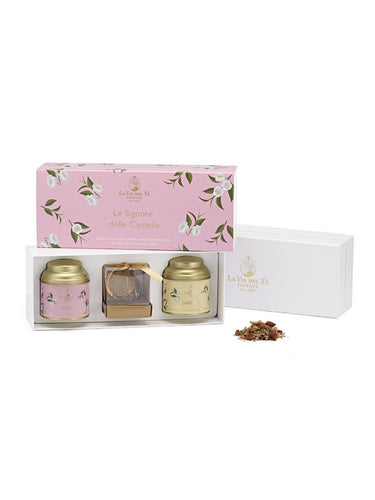 Contains the Kate and Gabrielle tea blends with a gold stainless steel tea infuser. La Via del Tè’s Signore delle Camelie collection is dedicated to women. The camellia flower evokes history's unforgettable muses, heroines, and adventurers who have marked their era, swimming against the tide.