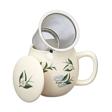 The Camilla Mug is designed for effortless and elegant tea preparation. Crafted from fine porcelain with a velvety matte finish, its rounded shape fits comfortably in your hand. The included stainless steel infuser allows for easy brewing, while the matching lid helps retain heat. Featuring a beautiful floral motif, this mug brings a sophisticated touch to your tea ritual. Dishwasher and microwave safe.