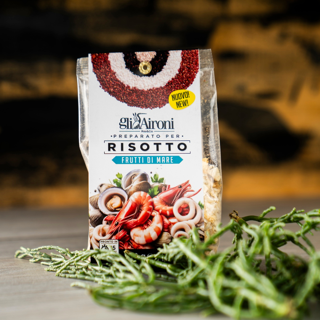This ready-to-cook Frutti di Mare Risotto is made with Gli Aironi’s minimally processed carnaroli rice, seafood broth, and freeze-dried clams, squid, and prawns. Gli Aironi's risottos, made from the finest ingredients, are the quick and easy way to make a delicious, traditional Italian risotto at home. Simply add the mix to a pot with extra virgin olive oil, toast for a few minutes while stirring, then add a splash of white wine or water. Slowly add more water until rice thickens. Makes a creamy, flavorful risotto in minutes.