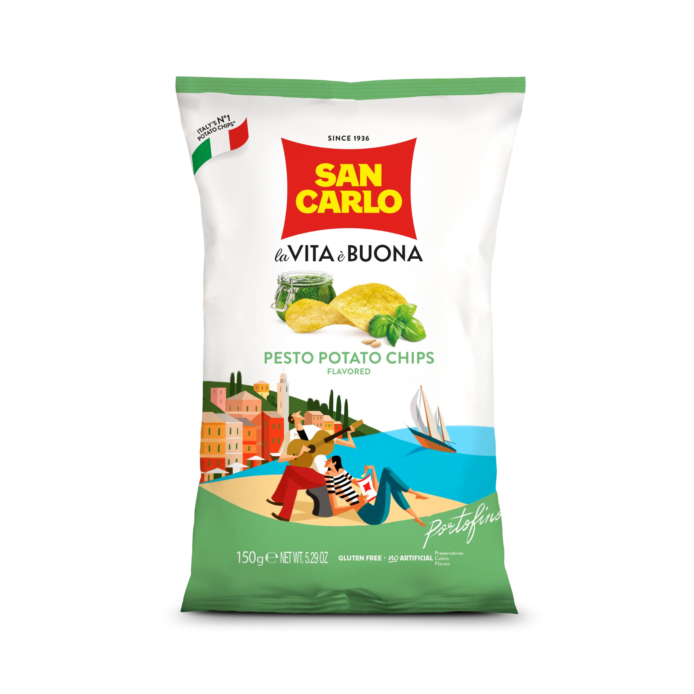 Made with the highest quality potatoes, San Carlo's Pesto Chips combine the perfect pairing of iconic Italian pesto and premium, crispy potato chips. Inspired by the picturesque charm of Portofino, these Pesto Potato Chips are crafted with authentic Ligurian pesto, bringing the fresh, aromatic flavors of the Italian coast straight to your snack time.