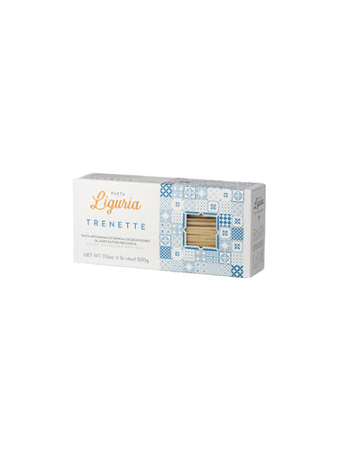 Reminiscent of Linguine, Trenette is a long, flat and narrow pasta, unique to the Ligurian region of Italy. The Trenette from Pasta di Liguria are hung to dry on canes, giving them the characteristical artisanal ‘U’ shape. Delicious served with pesto, potatoes and green beans or with fresh seafood for a traditional Ligurian meal.