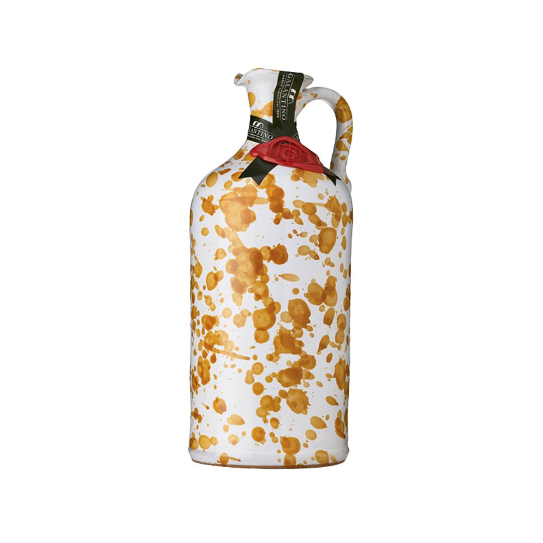 The “Fantasia" ceramic bottle comes in a variety of colors and patterns and is hand-painted by local artisans of the Puglia region of Italy, where the award-winning Frantoio Galantino olive mill is located. It is filled with their delicious and authentic extra virgin olive oil made from Ogliarola and Coratina olives. Golden yellow-green in color and well balanced flavors of almond and artichoke make this an ideal extra virgin olive oil for everyday use. Great for cooking and for dressing a salad.